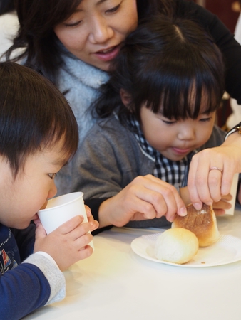 焼き立てのパンを食べて、わいわいとキャンプトークして
