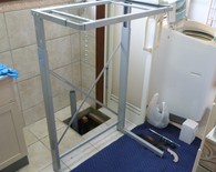 排水管を移設し床面をモルタルにて仕上げ、乾燥機のラックを組み立てて、所定の位置に設置していきます。配水管の移設が必要となる場合は、このような工事が必要となりますのでお気軽にご相談くださいませ。