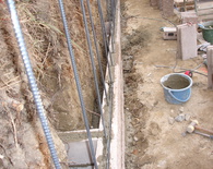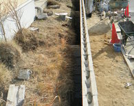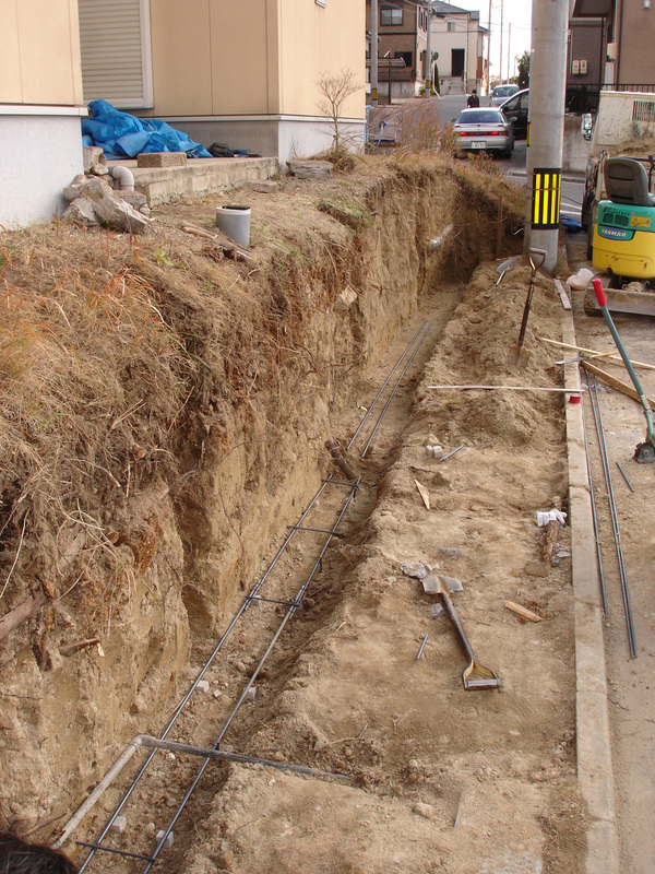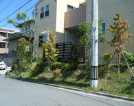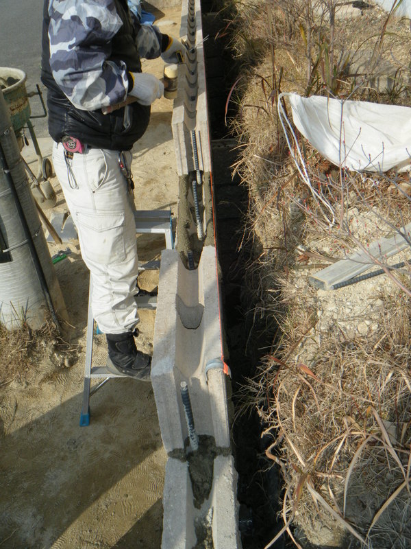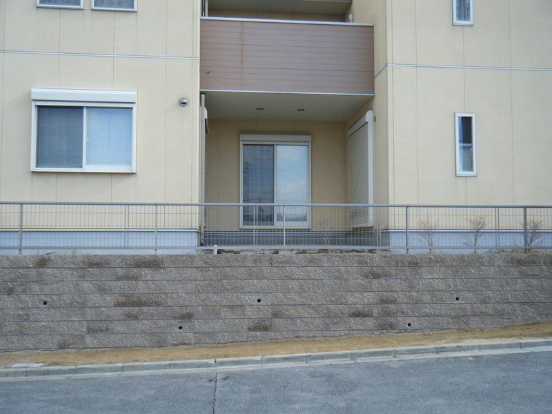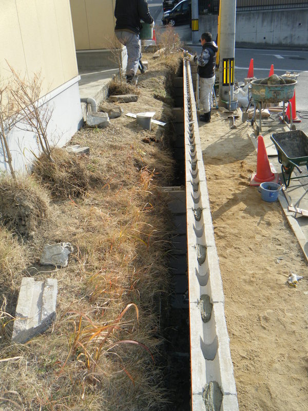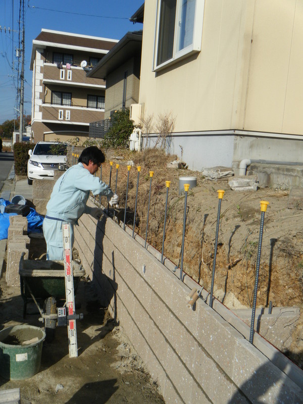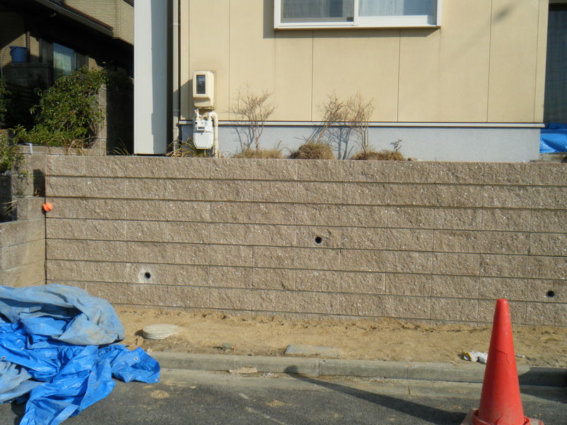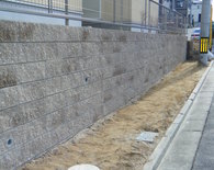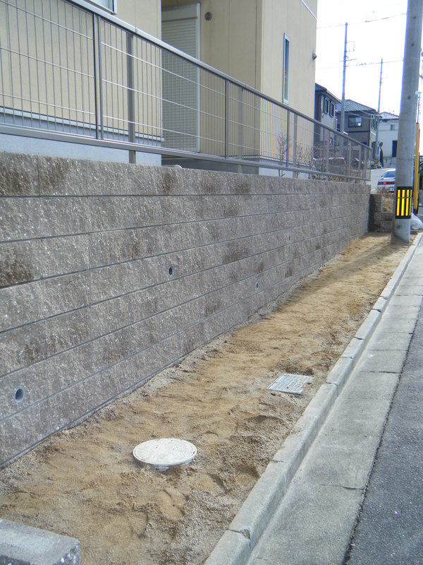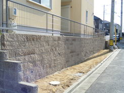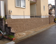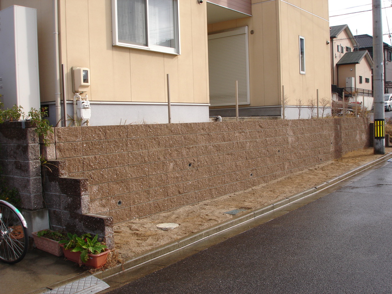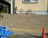 土留めという事で 強度を保つ為にベースをしっかりとさせ、縦筋・横筋を入れるのはもちろんの事、支えとして数箇所に渡ってメインブロックに対し直角にブロックを積上げています。ウッドデッキも撤去し見違えるほど光も入りすっきりとした外観になりました。お客様が悩んでいましたフェンスの色もお宅の色調とピッタリと合っていてとてもいい感じと成りました。
