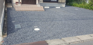 今回は全面芝が有ったのでその芝を撤去しながら約5センチくらい土を鋤取り、施主様の意向により、車が踏みつけない隅に防草シートを敷きました。その上に約3センチくらいの大きさの砕石を敷き水道メーター、汚水桝の高さを調整(天板合わせ)しました。高さを均一することで駐車スペースが少し広がりました。お客さまからは 『きれいに仕上がり満足です! 新車が来る予定なので、スペースが広くなり嬉しいです』とおっしゃっていただけました。
