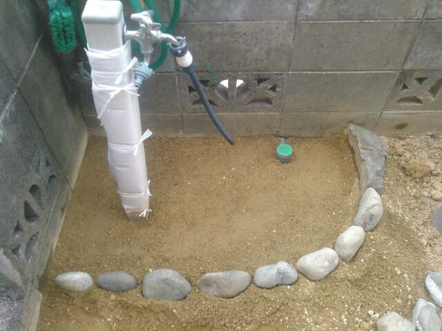 以前お客様宅でコンクリートを打設工事をする際に石で手洗い場を囲って欲しいとリクエストを頂きました。