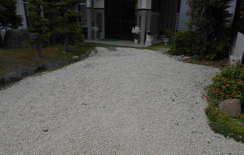車の出入りする箇所や人がよく通る箇所の砂利が土の中へ入り込んでデコボコして水溜りができるようになってしまったので砂利を現状から敷き増しする作業をさせていただきました。また今回は砂利を敷きその上に『ビリ』と言う白っぽい砂利をまき見栄えをよくしました。お客様にもきれいになったと喜んでいただけました!