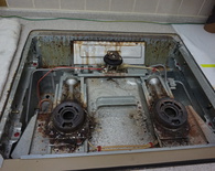 ガスコンロの交換作業についてご紹介します。2008年以前のガスコンロで安心センサー Siセンサーがついていませんでした。古いガスコンロを取り外して最新設備がついたガスコンロと交換していきます。