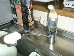 部品で交換も出来たのですが、阪神淡路大震災以降はレバーを下げると水が止まる仕様になり地震対策の為にも今回は全てを交換する事にしました。(現在はレバーを下げると水が出る仕様でした)