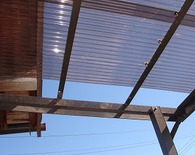 波板は耐衝撃性優れていて若干ですがアクリルよりも耐熱性が有るポリカ-ボネート波板を使用してます今回は、部屋に日差しが差し込むように色は薄めの色を使用しています。