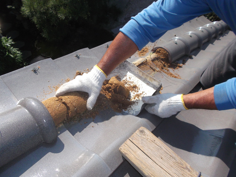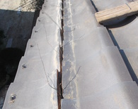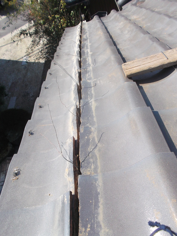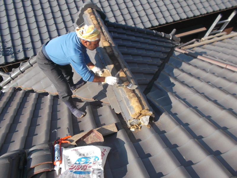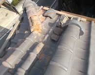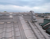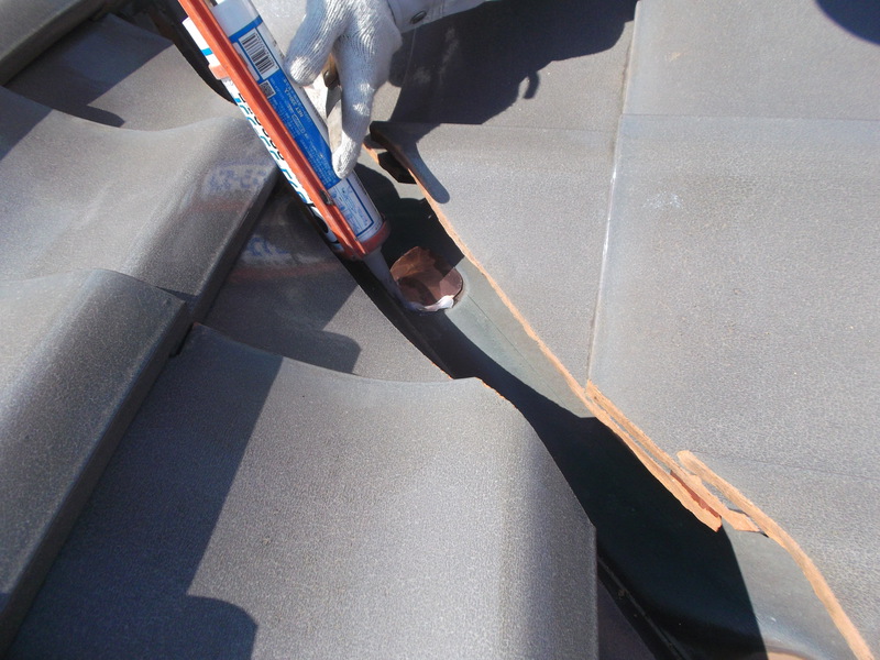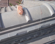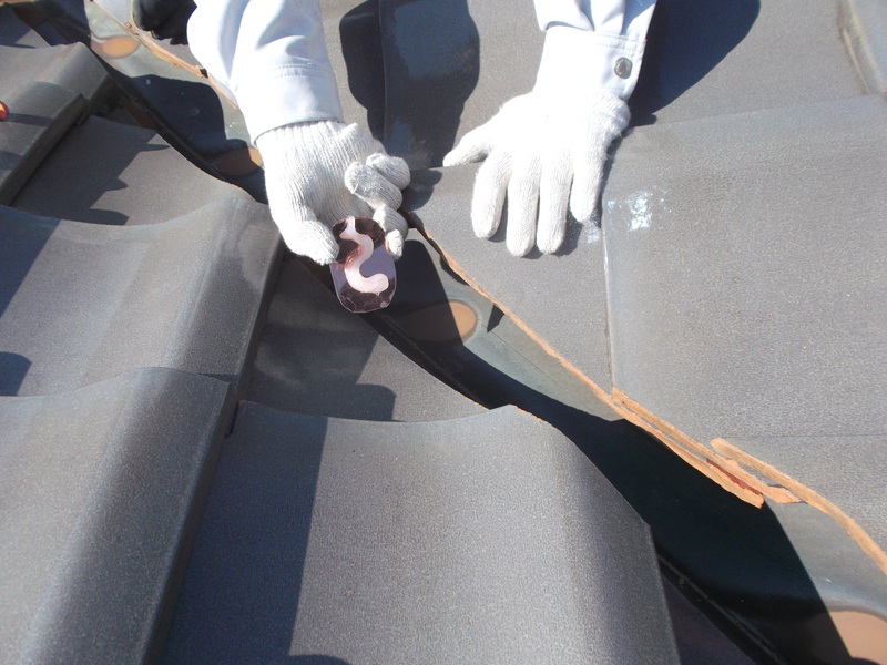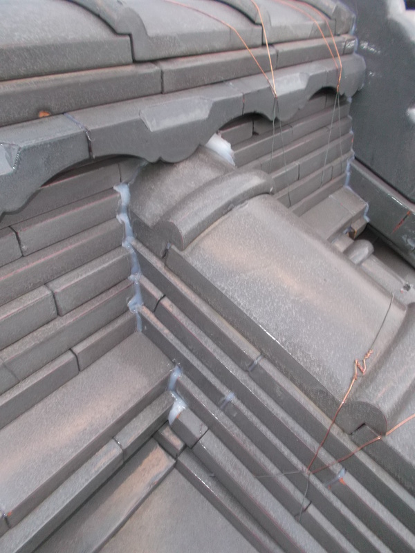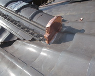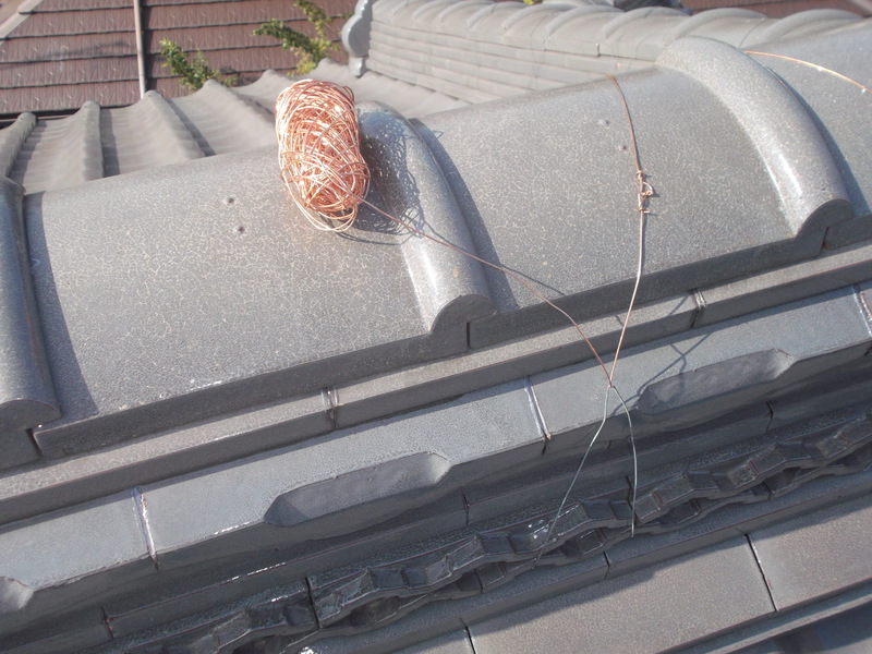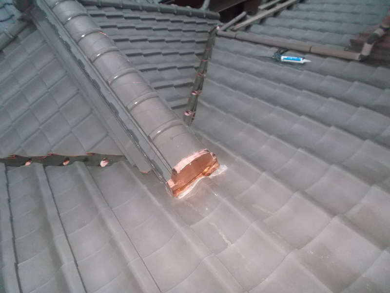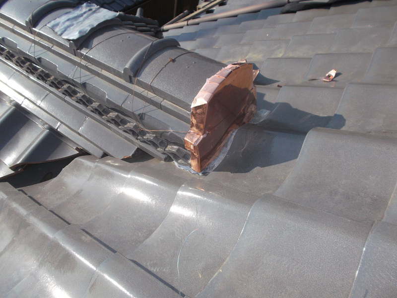 まず屋根(瓦)の状態を確認させて頂きました・屋根の谷部を銅板でパッチワーク補修 ・一部漆喰の補修 ・屋根の棟先を銅板で修繕 ・隙間をシリコンで補修 ・熨斗瓦、冠瓦のやり直し ・トンボ穴の補修 ・銅線のやり直し等部分的に修繕させていただきました