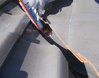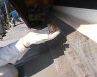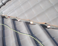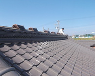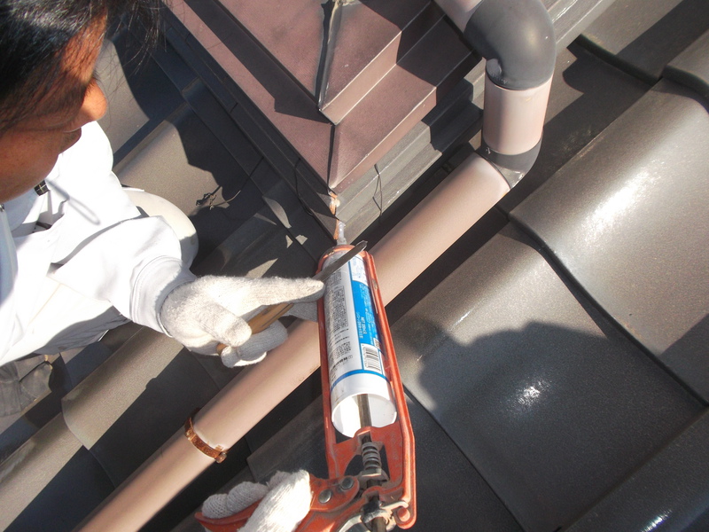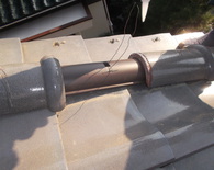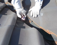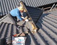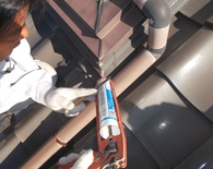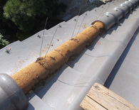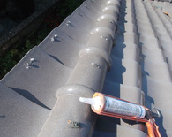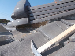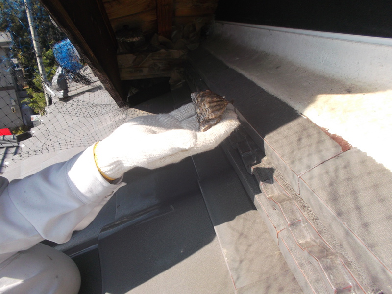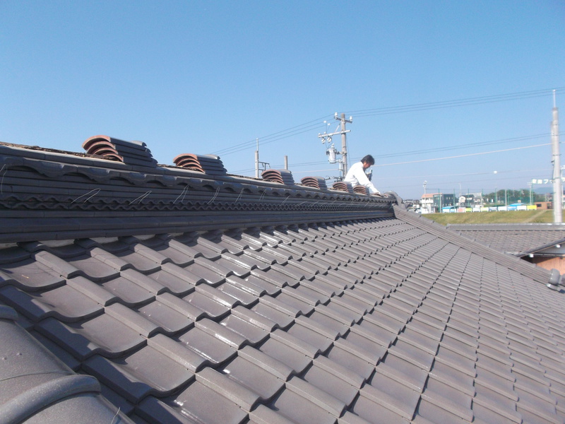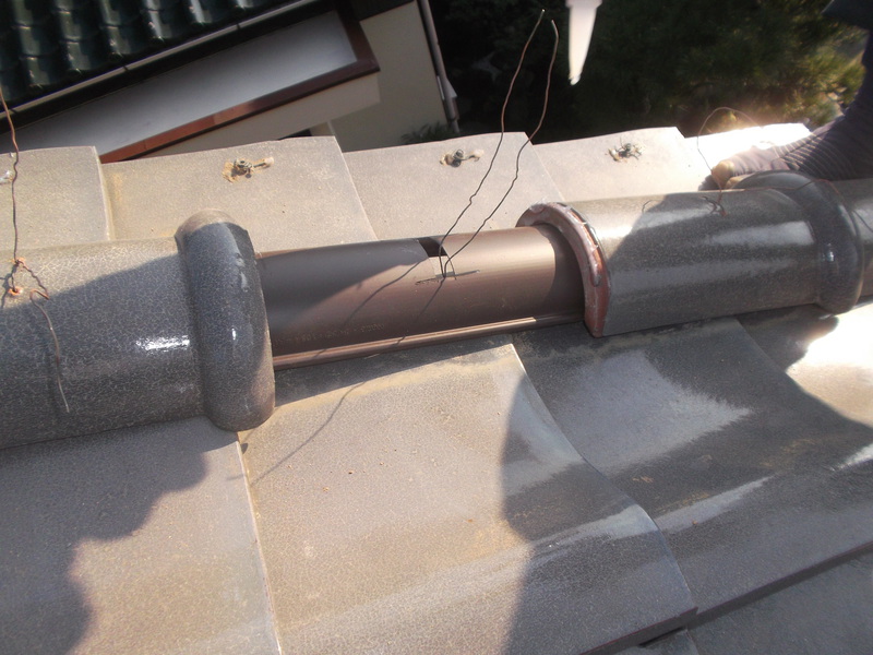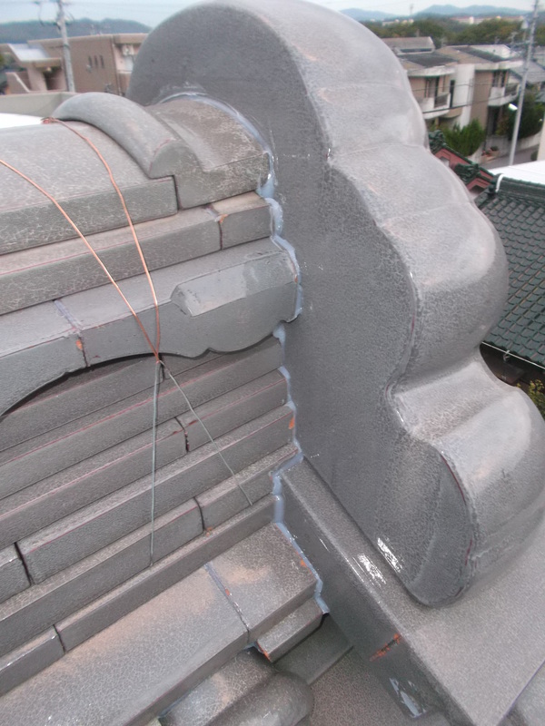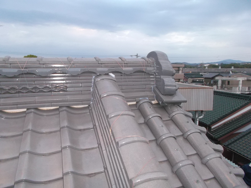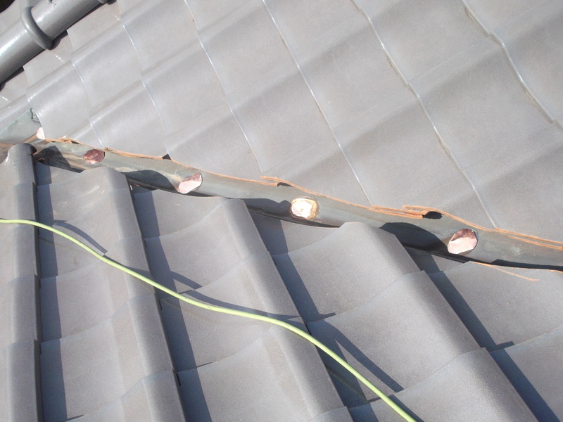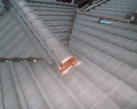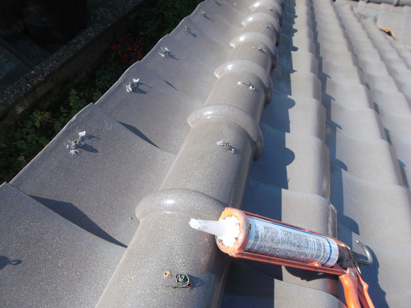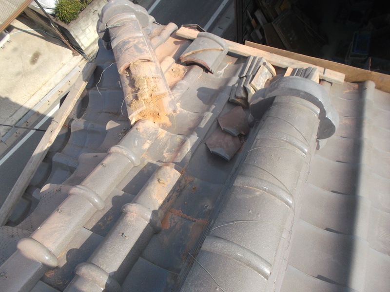 まず屋根(瓦)の状態を確認させて頂きました・屋根の谷部を銅板でパッチワーク補修 ・一部漆喰の補修 ・屋根の棟先を銅板で修繕 ・隙間をシリコンで補修 ・熨斗瓦、冠瓦のやり直し ・トンボ穴の補修 ・銅線のやり直し等部分的に修繕させていただきました
