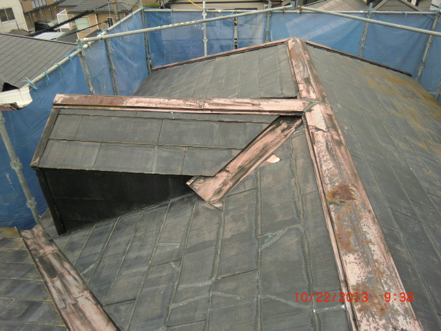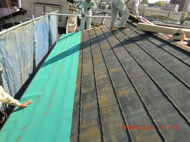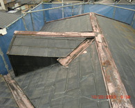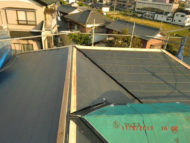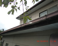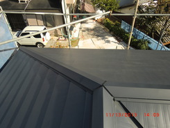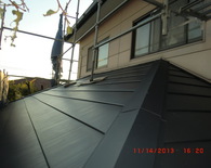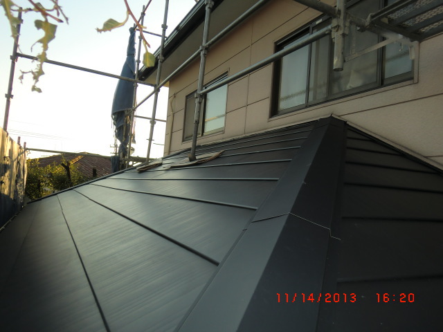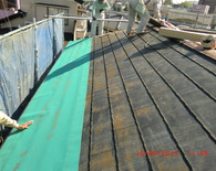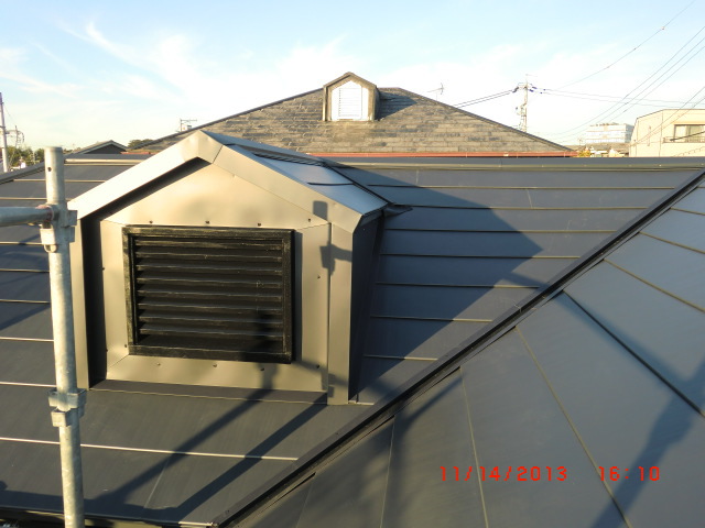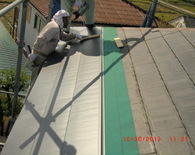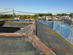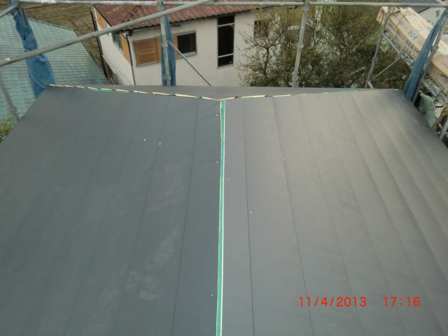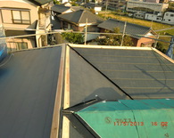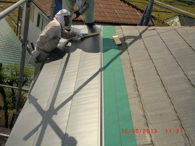 建物を建ててから1度屋根塗装をしているとの事でしたが、その後のメンテナンス時期を逃してしまった結果コケが生えてしまったので今回はガルバリウム鋼鈑で吹き替えする事にしました。ガルバリウム鋼鈑はアルミと亜鉛で哲を守る事により生まれた耐久性に優れた鋼鈑です。今までのトタンと比べても5.6倍の耐久性があります。もちろん劣化も有りますが外面塗装は10年〜15年は持ちます。