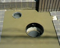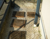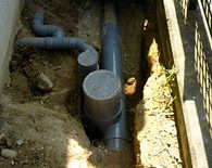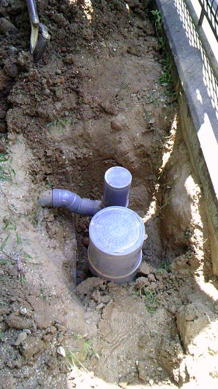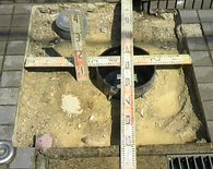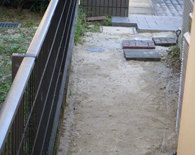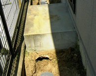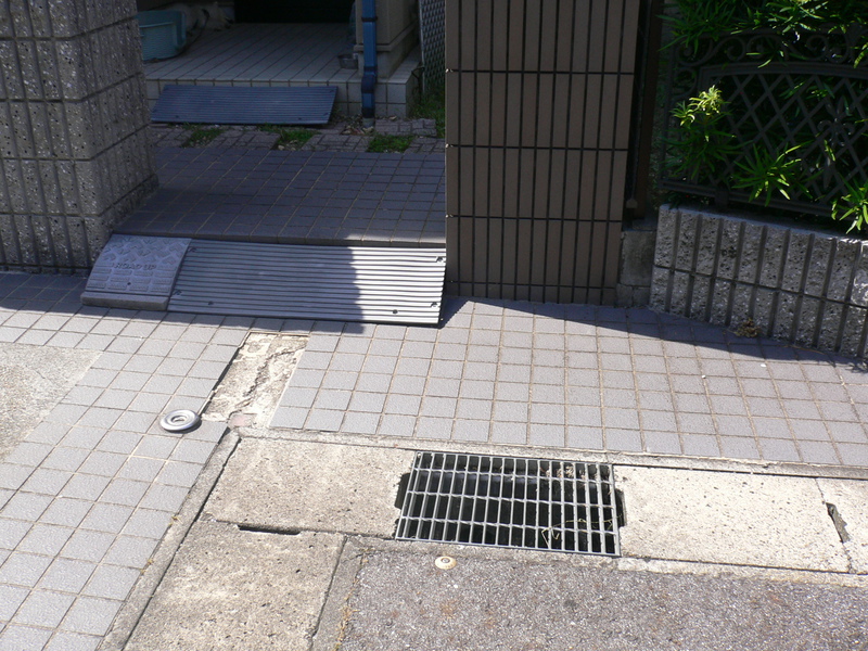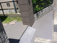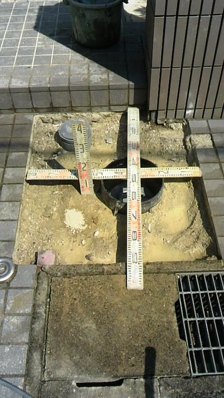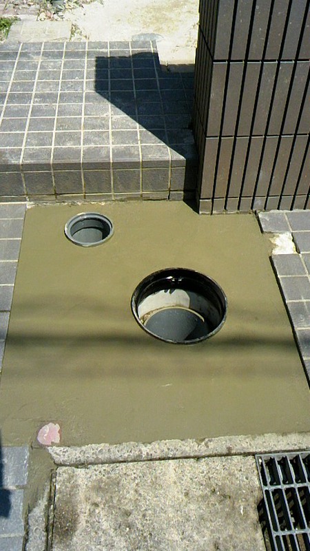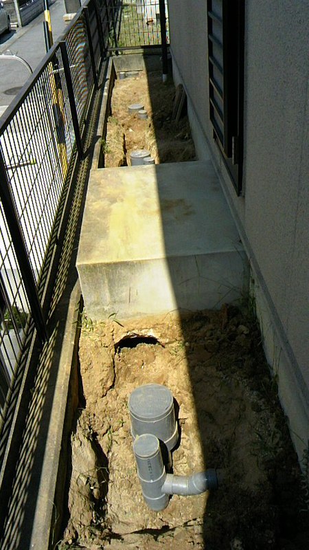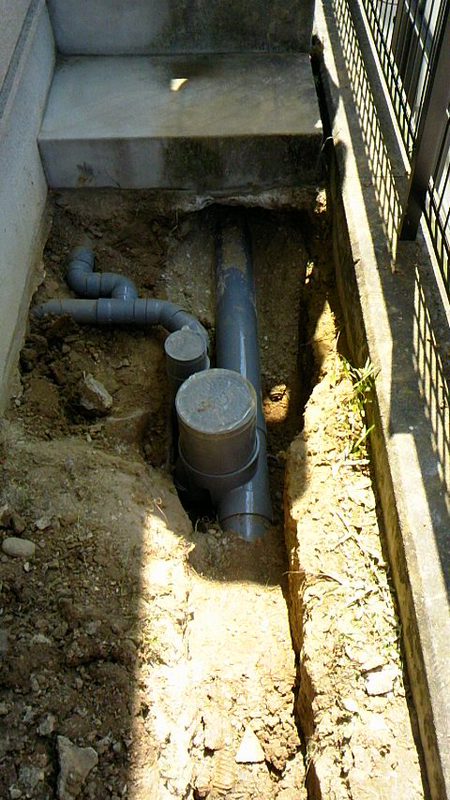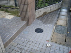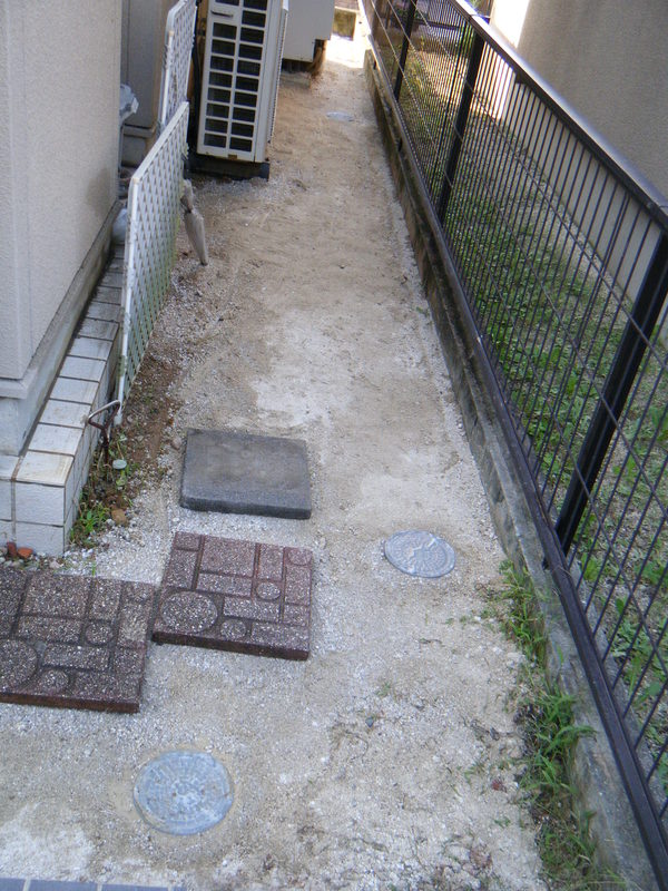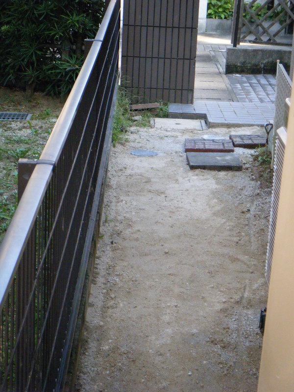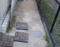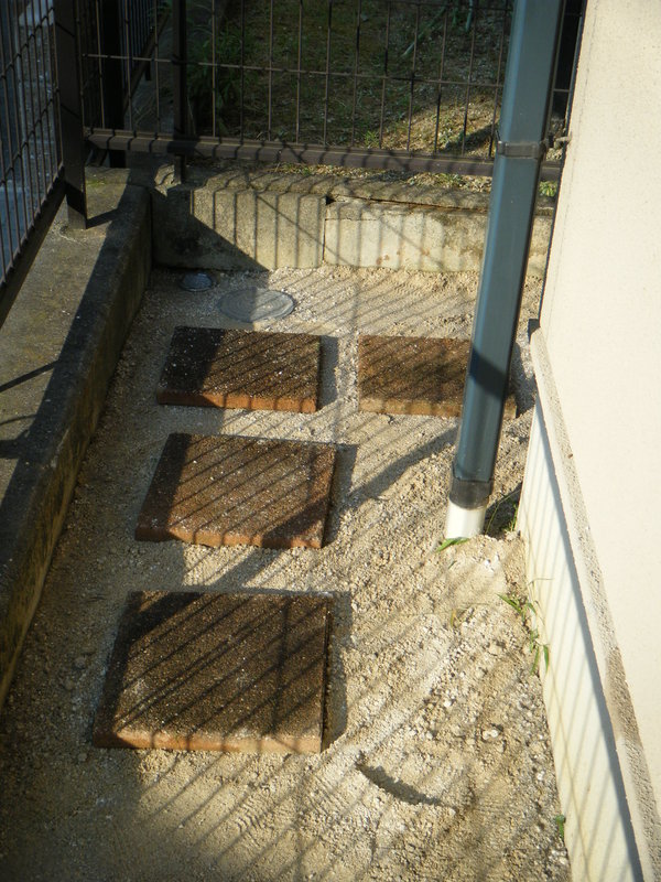 門のアプローチのタイルが剥がれていたので下水工事と一緒に張替えもしました。本管に繋ぐ工事として門の下をトンネルを掘り繋いでいます。今まで桝が有ったり 浄化槽が有ったりで雑然としていた通路も踏み石を置いたりしてすっきりとしました。