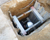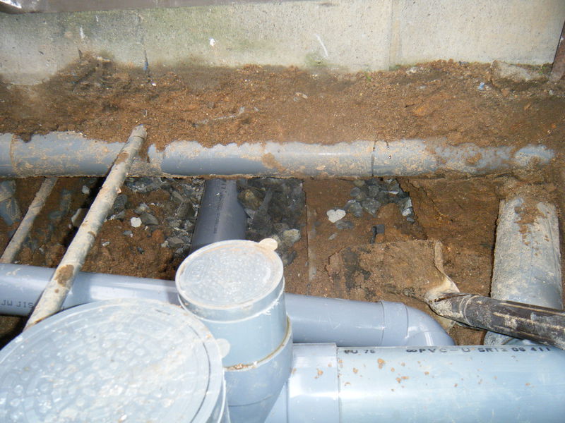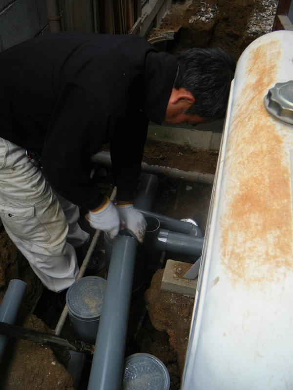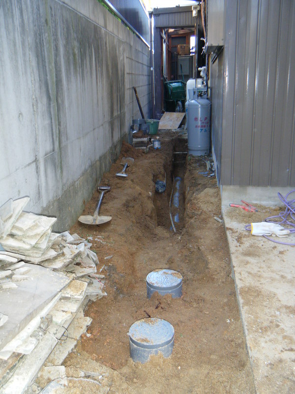 2メートル以上掘り起こす工事で ユンボも入らない箇所も有り そのような場所は手掘りで少し大変でした。安全面には特に気を使い、安全対策の為の矢板の設置(土が崩れない為)をしての工事でした。キッチン裏の小屋への接続はトンネル工法で配管接続してますので、建物を傷つける事無く仕上ています。雨天もあり工期も少し延びてしまいお客様にはご迷惑をお掛けしました。