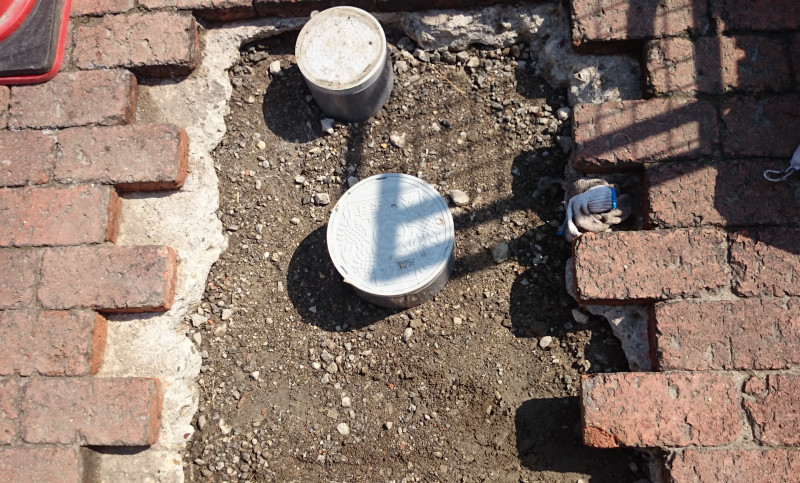 今回、お客さまの駐車場のレンガ敷きの箇所に汚水桝を設置することになりました。綺麗に敷き詰められたレンガの箇所に穴をあけて汚水桝を設置するわけですが、普通だと、その箇所をコンクリートなどで四角く舗装して仕上げることが多いかと思います。お客様のご要望にお応えして汚水桝の円形に近くなるようレンガを切断し、セメントを敷いて、その上に切断したレンガをきれいに並べていきました。お客様からも「イメージ通りです」とお褒め頂けました。