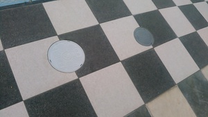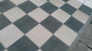 駐車場一面おしゃれなタイル張りのお宅で下水道工事をさせていただきました。タイルを必要な箇所のみ壊し、原状回復させるという工事をしました