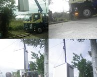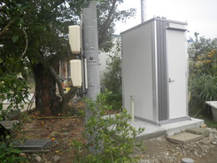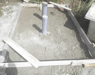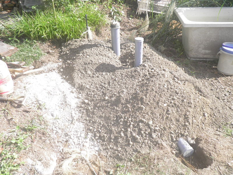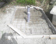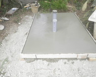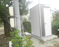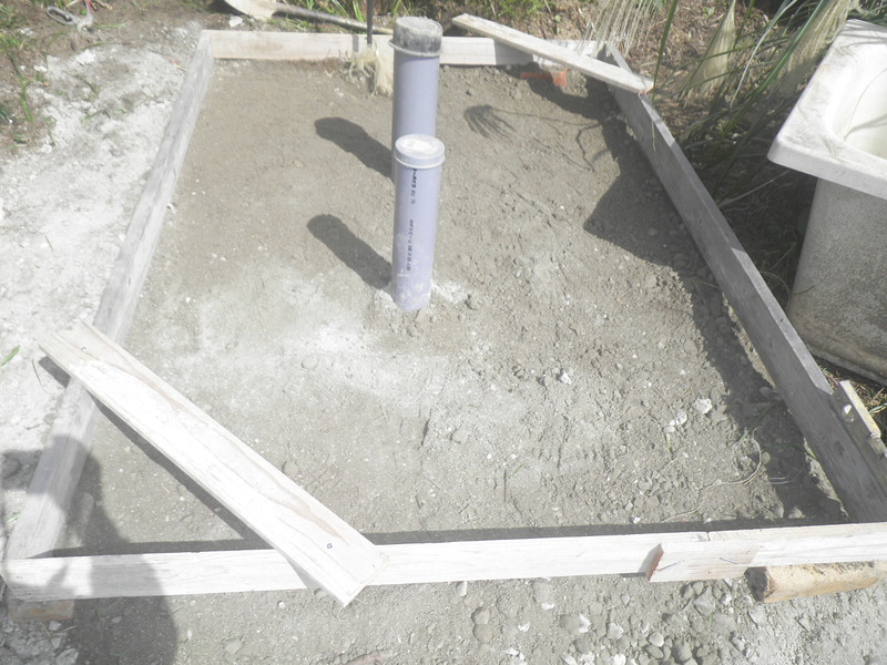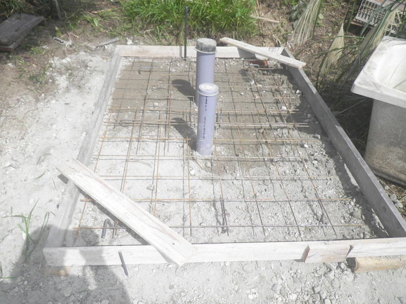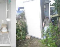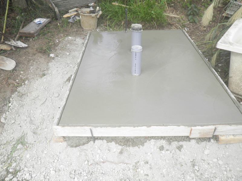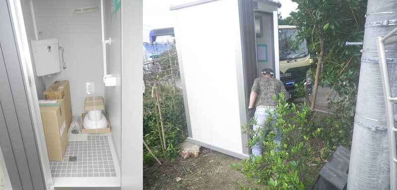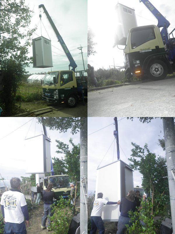 土間工事ののち、クレーンでトイレを吊り上げて設置しました。